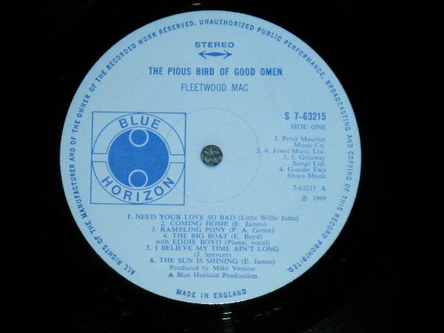 ARTIST : FLEETWOOD MAC TITLE : THE PIOUS BIRD OF GOOD OMENLABEL : BLUE HORIZON CONDITIONJACKETDISKExMINT- BB HOLEAT RIGHT UPPER NEAR CORNER No. : S 7-63215OTHERS : 1969 UK ENGLAND ORIGINAL Used LP Matrix Number A) A 1 B) B 1 ※サイト内のすべての画像のコピー・無断転用を禁止しています。 個人・法人様のサイト(ブログ・HP・掲示板等)でのご紹介で使用されたい場合は前もってご連絡下さい