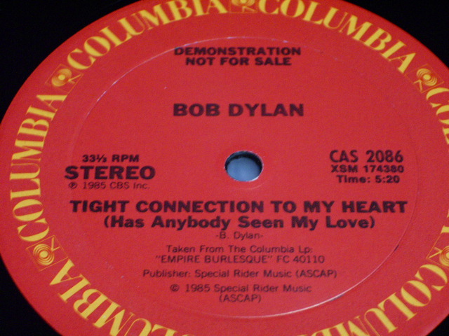 ARTIST: BOB DYLAN TITLE: TIGHT CONNECTION TO MY HEART LABEL: COLUMBIA NO: CAS-2086 CONDITION JACKET DISK E++ E+++ A・B・C・D A・B・C・D OTHERS: US ORIGINAL ..PROMO ONLY 12". VERY RARE PROMO ONLY .PROMO ONLY .FEW MINOR HAIR SCUFFS ,PLAYS FINE. 存在を確認できたレア・アイテムです。