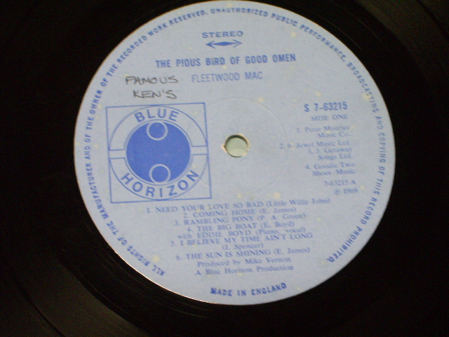 ARTIST : FLEETWOOD MAC TITLE : THE PIOUS BIRD OF GOOD OMEN LABEL : BLUE HORIZON CONDITIONJACKETDISKEx++Ex+++ WRITING ON FRONT COVERNo. : S 7-63215OTHERS 0 <RELEASE INFORMATION> 1969 UK ENGLAND ORIGINAL Used LP ※サイト内のすべての画像のコピー・無断転用を禁止しています。 個人・法人様のサイト(ブログ・HP・掲示板等)でのご紹介で使用されたい場合は前もってご連絡下さい
