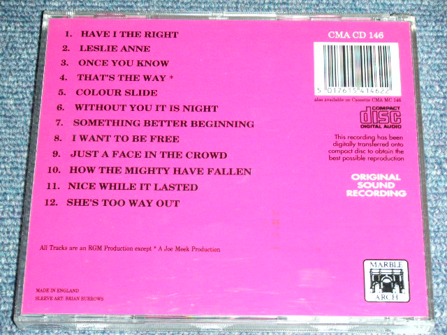 ※サイト内のすべての画像のコピー・無断転用を禁止しています。個人・法人様のサイト(ブログ・HP・掲示板等)でのご紹介で使用されたい場合は前もってご連絡下さい。 ARTIST : THE HONEYCOMBS TITLE : THE BEST OF LABEL : MARBLE ARCH CONDITION JACKET DISK MINT- MINT No. : CMA CD 146 OTHERS : 60's UK BEAT