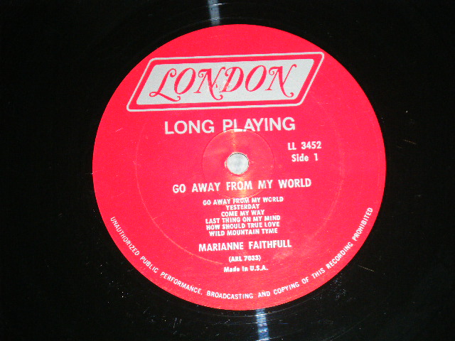 MARIANNE FAITHFULL - GO AWAY FROM MY WORLD ( Matrix # A)ARL 7033-1 N B)ARL 7034-1 N ) (Ex++,Ex/Ex+++ ) / 1965 US AMERICA ORIGINAL "RED Label with Boxed LONDON " MONO Used LP [LONDON LL-3452 MONO]