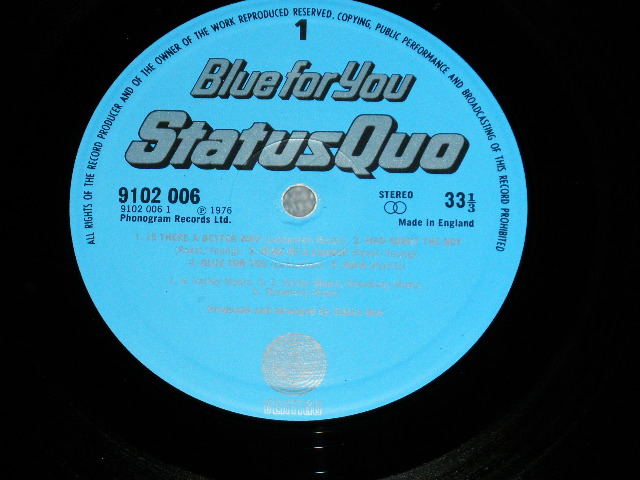 STATUS QUO - BLUE FOR YOU (Matrix # A) 1//1/B) 2//1 ) ( Ex++/MINT- ) / 1976 UK ENGLAND ORIGINAL Used LP [VERTIGO 9102 006]