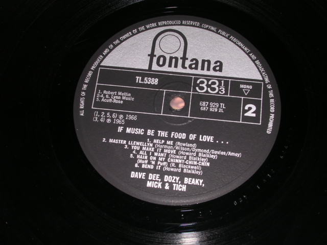 ARTIST : DAVE DEE GROUP(DAVE DEE,DOZY,BEAKY,MICK & TICH ) TITLE : IF MUSIC BE THE FOOD OF LOVE... LABEL : FONTANA CONDITION JACKET DISK Ex+ Ex+++ No. : TL-5388 OTHERS : MONO