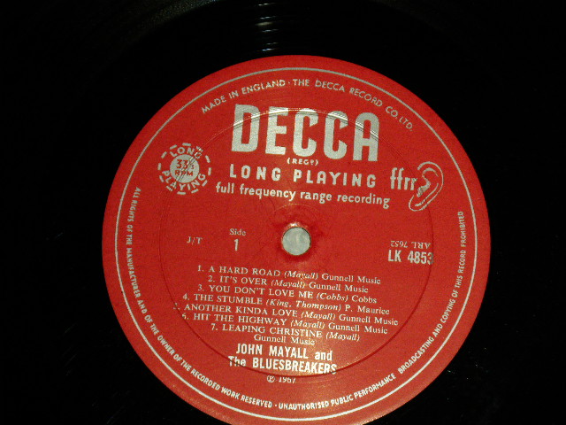 JOHN MAYALL and The BLUES BRAEKERS (with PETER GREEN) - A HARD ROAD (Matrix # A)ARL-7652-2A 1 GG KT B)ARL-7653-2A 1 UC KT) (Ex/Ex+ Looks:Ex-) / 1967 UK ENGLAND ORIGINAL "MARLOON with Un-boxed DECCA Label" MONO Used LP[DECCA LK-4853 MONO]