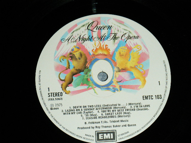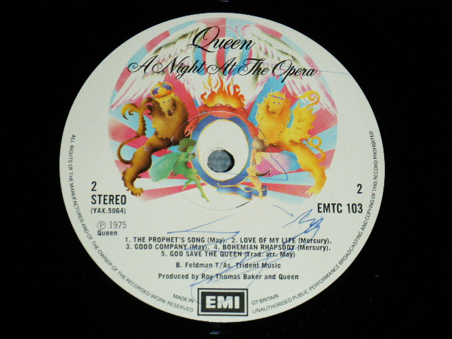QUEEN - A NIGHT AT THE OPERA (With CUSTOM INNER) (Matrix #A) YAX 5063-4 2 GM BLIA'S B) YAX 50+4-4 BLAIR'S 2 GDG) (Ex++/Ex+++ B-3:Ex) / 1975 UK ENGLAND ORIGINAL ''Crest design © Queen Production Ltd 1975'' Used LP [EMI EMTC-103]