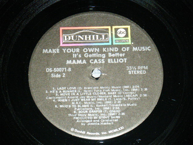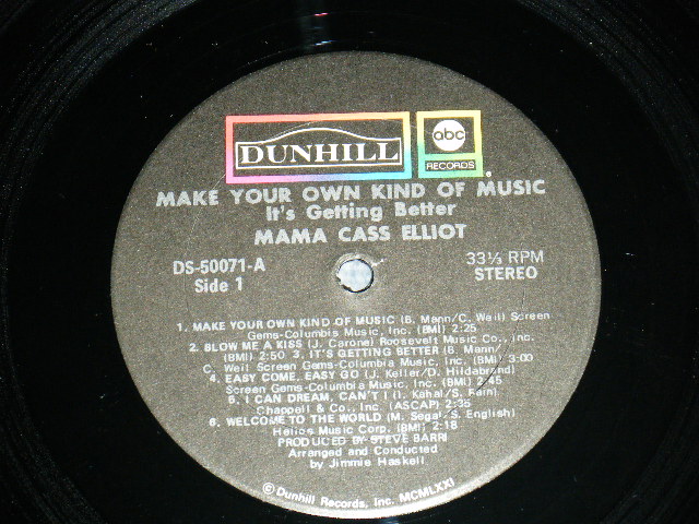 MAMA CASS ELLIOT (of MAMAS & PAPAS) - MAKE YOUR OWN KIND OF MUSIC (Matrix # A) DS-50071-A B) DS-50071-B) ( "© Dunhill Records, Inc. MCMLXXI" at Label Bottom Rim) (MINT-/MINT- Cut Out) / 1969 (1971 Version?) US AMERICA ORIGINAL "Un-GLOSSY Label" Used LP [DUNHILL DS-50071]