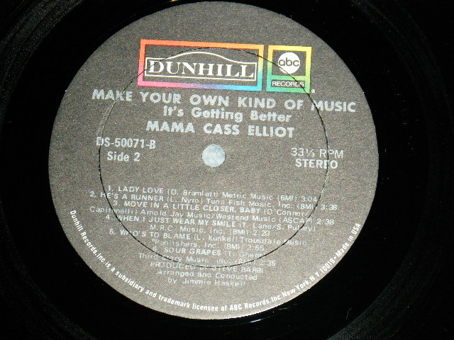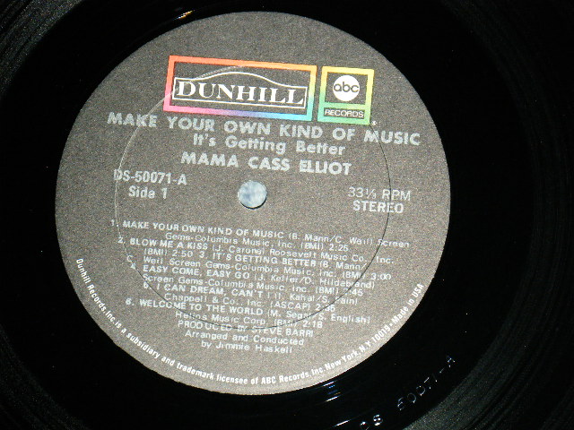 MAMA CASS ELLIOT (of MAMAS & PAPAS) - MAKE YOUR OWN KIND OF MUSIC (Matrix # A) DS-50071-A LW B) DS-50071-B LW) ("Dunhill Records Inc. / New York / Beverly Hills / A Subsidiary of ABC Records, Inc. / 1330 Avenue Of The Americas, N.Y. / Made in U.S.A" at Label Bottom RIM) (Ex++/MINT-) / 1969 US AMERICA ORIGINAL "Un-GLOSSY Label" Used LP [DUNHILL DS-50071]
