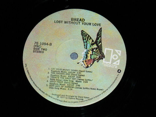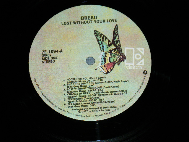 BREAD - LOST WITHOUT YOUR LOVE (Matrix #AA)7E 1094-A RE 11-1 TML-S B)7E 1094-B RE 11-111 TML-M) "PRC Press in INDIANA" (Ex++/MINT- BB) / 1977 US AMERICA ORIGINAL "BUTTERFLY Label" Used LP [ELEKTRA 7E-1094]